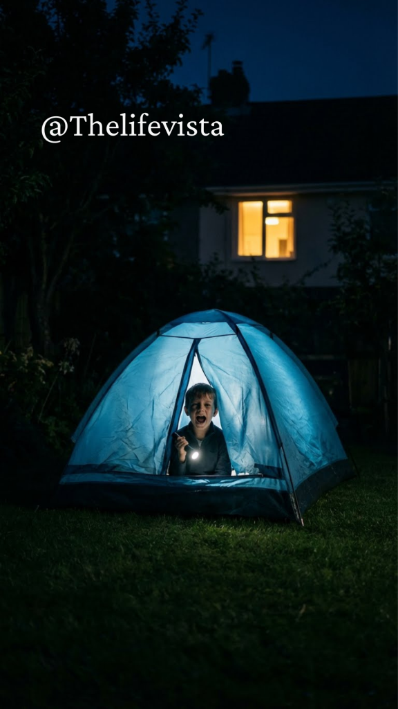 So, we let him. We set up the blue Coleman tent near the oak tree. Evan marched out with his sleeping bag, a flashlight, his Nintendo Switch, and a family-sized bag of Goldfish crackers. He looked like he was preparing to conquer Everest, or at least the neighbor’s cat.