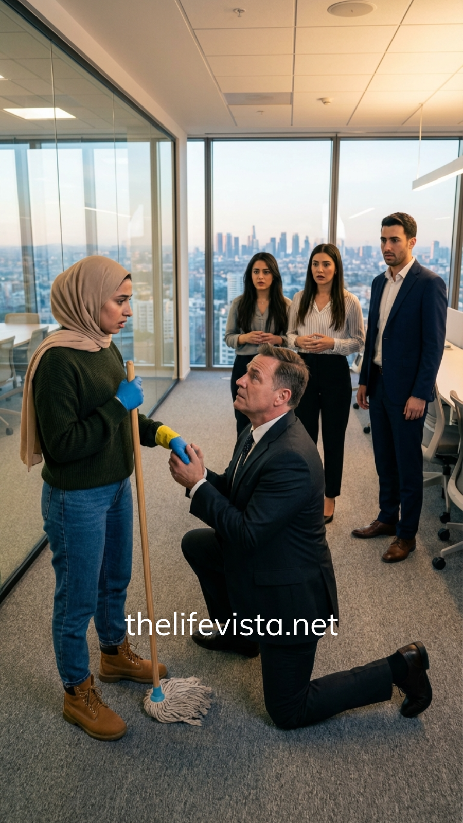 She arrived before most of the lights were turned on and often left long after the last elevator ride of the night. She moved quietly through the hallways, working without complaint or conversation. Always the same plain clothes. Always the yellow cleaning gloves. Always the faded headscarf tied tightly around her hair, shadowing most of her face.