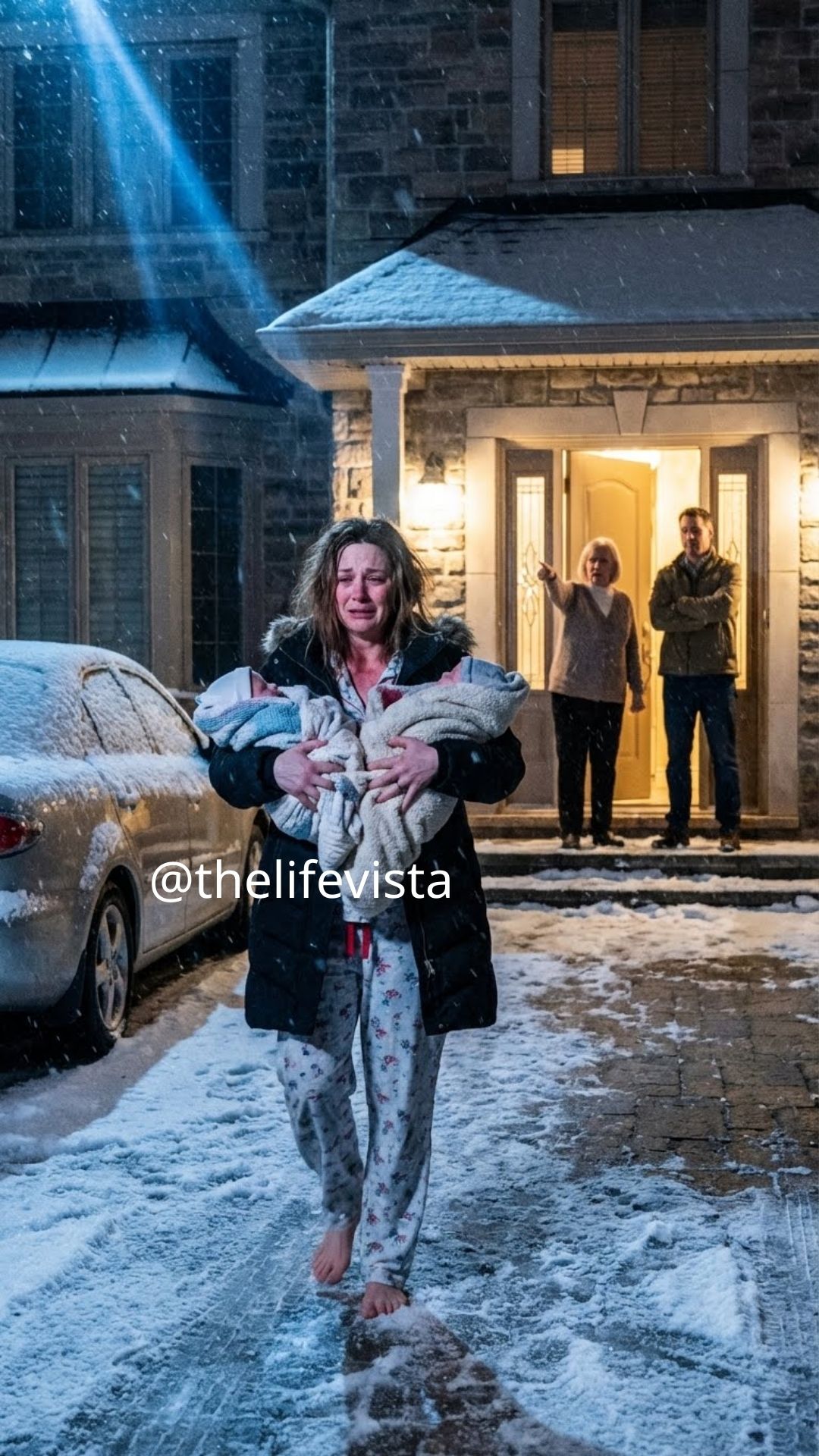 My mother-in-law, Linda Parker, shrieked the words so loudly that her spit landed on my cheek. I stood there stunned, holding my ten-day-old twin daughters against my chest, their tiny bodies trembling beneath thin blankets. Snow drifted down the driveway, the air sharp and unforgiving.