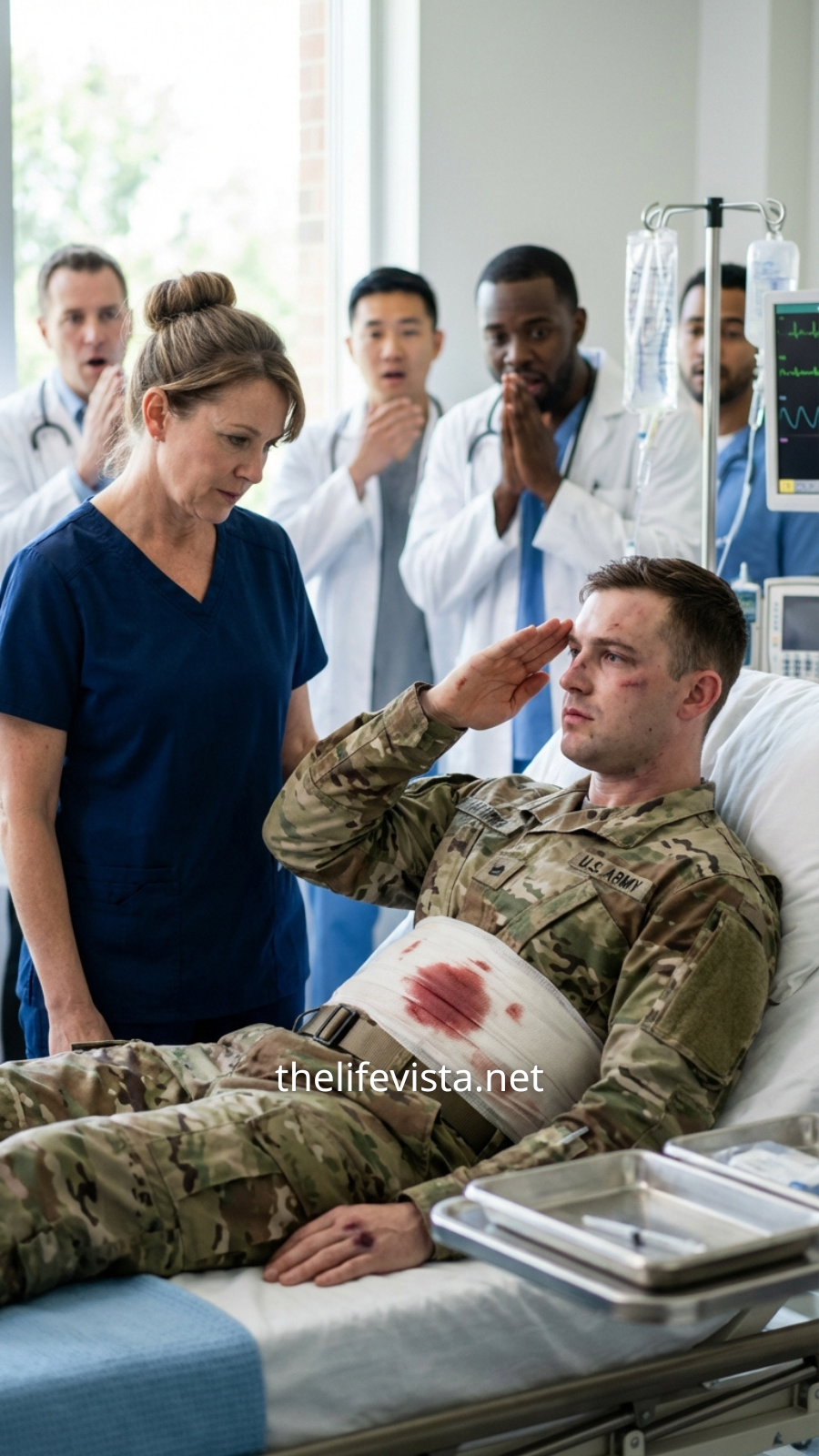 A Navy SEAL team rushed in, carrying their leader—Commander Ryan Keller—barely conscious, his uniform soaked with blood. The room snapped into action instantly—monitors chiming, nurses calling out vitals, interns scrambling for equipment.