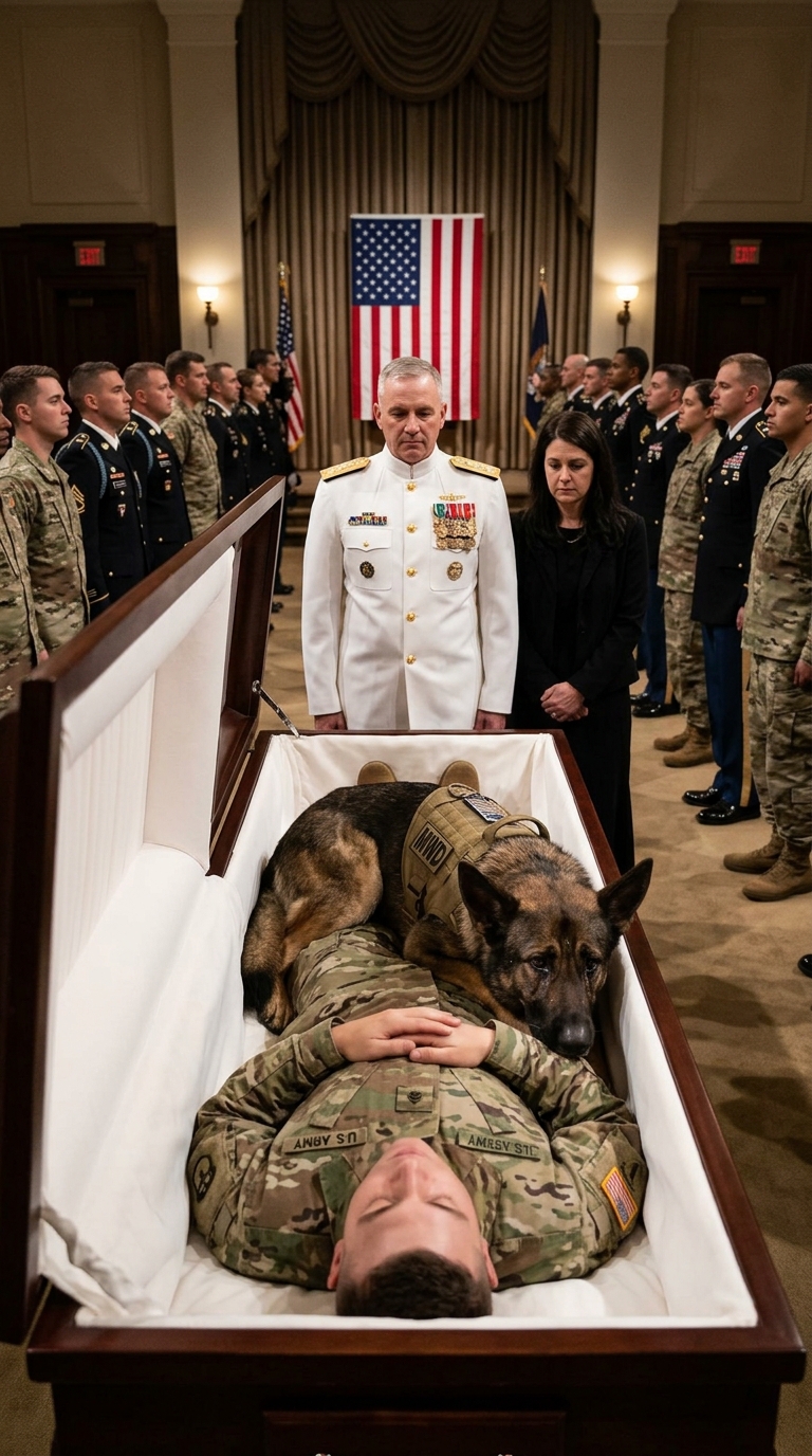 The chapel at Coronado Naval Base went rigid as the military working dog Ranger exploded forward. One second he was sitting perfectly at heel, the next he vaulted up, paws thudding against polished wood, and dropped into the open casket like a shield. The fallen operator—Chief Petty Officer Adrian Hale—lay in dress uniform, flag folded nearby, grief hanging over the room like salt air.
