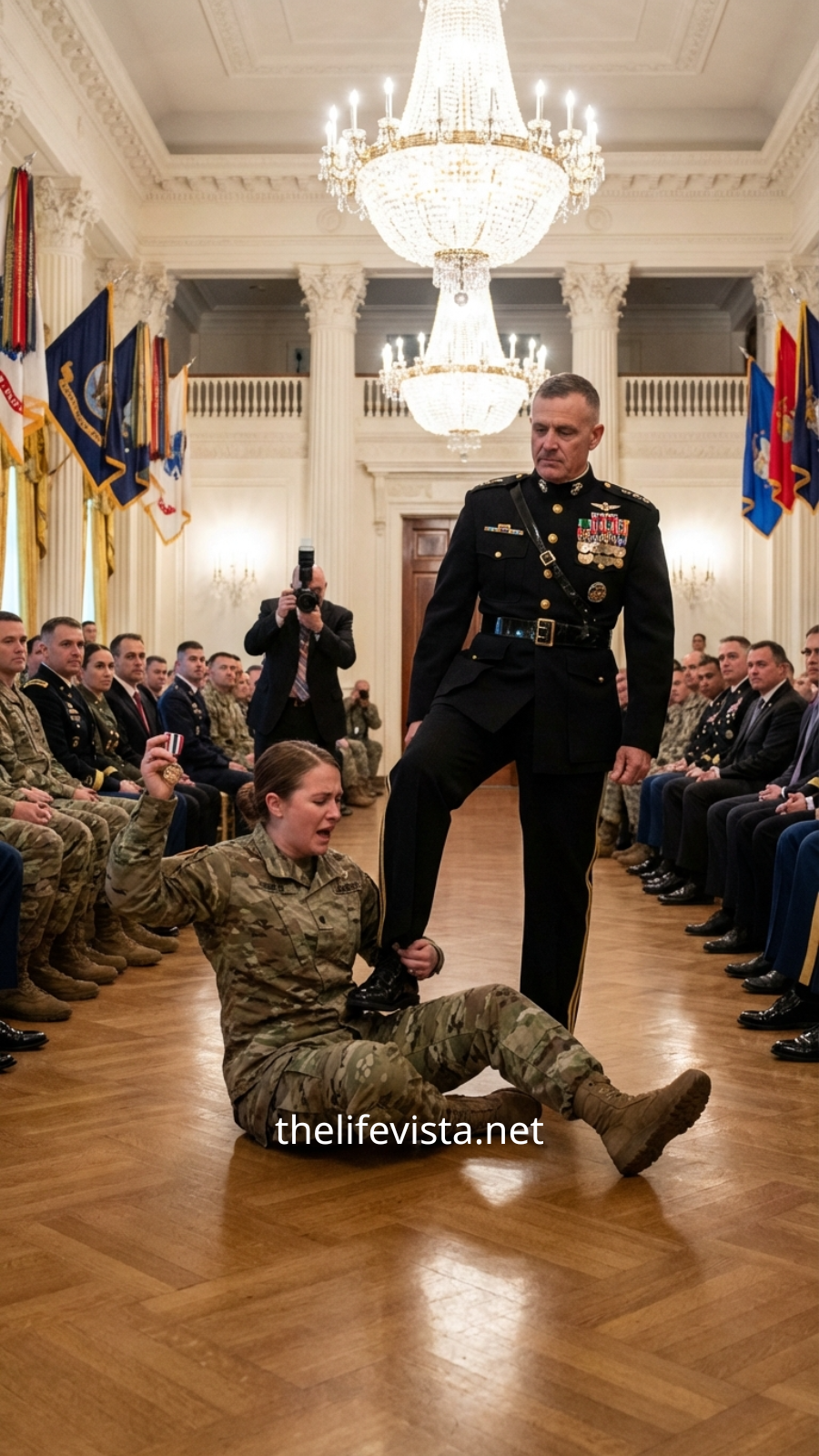 The chandeliers inside the Fort Hamilton Officers’ Club cast a warm, polished glow across a room designed for speeches, applause, and carefully staged photographs. Soft brass music drifted between tables draped in linen, and rows of dress blues shone like polished armor. It was an evening built on order and image—precise, ceremonial—until one person stepped inside who didn’t match the picture.