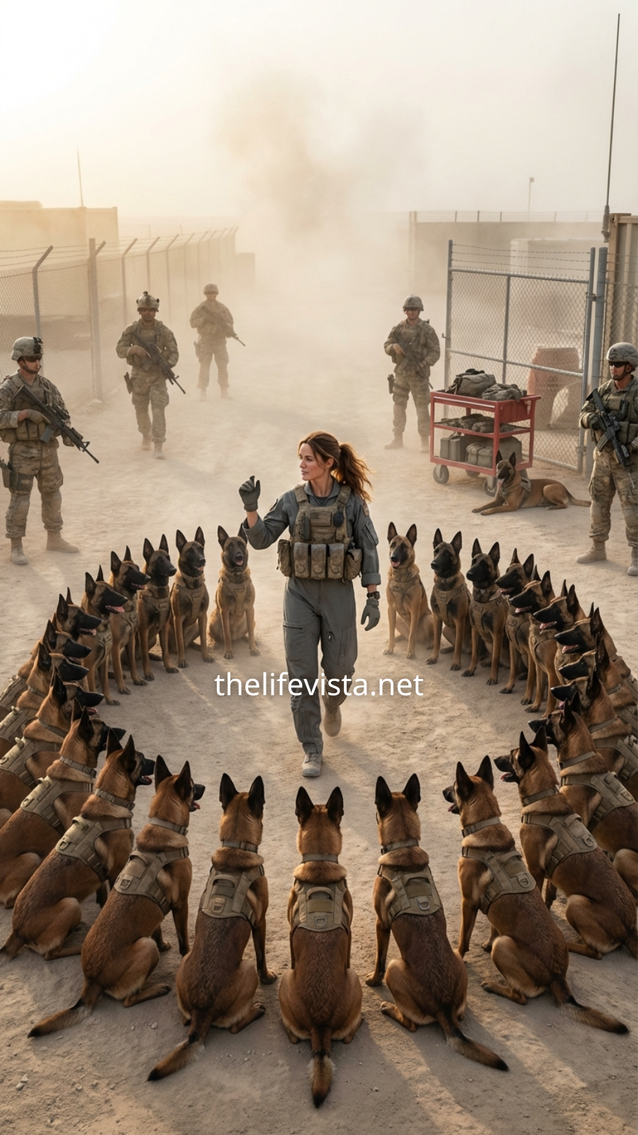 Forty-seven trained military animals, settled in absolute unison, eyes still locked on her, their collective posture forming something unmistakably defensive, as if the space around her had become sacred ground.
