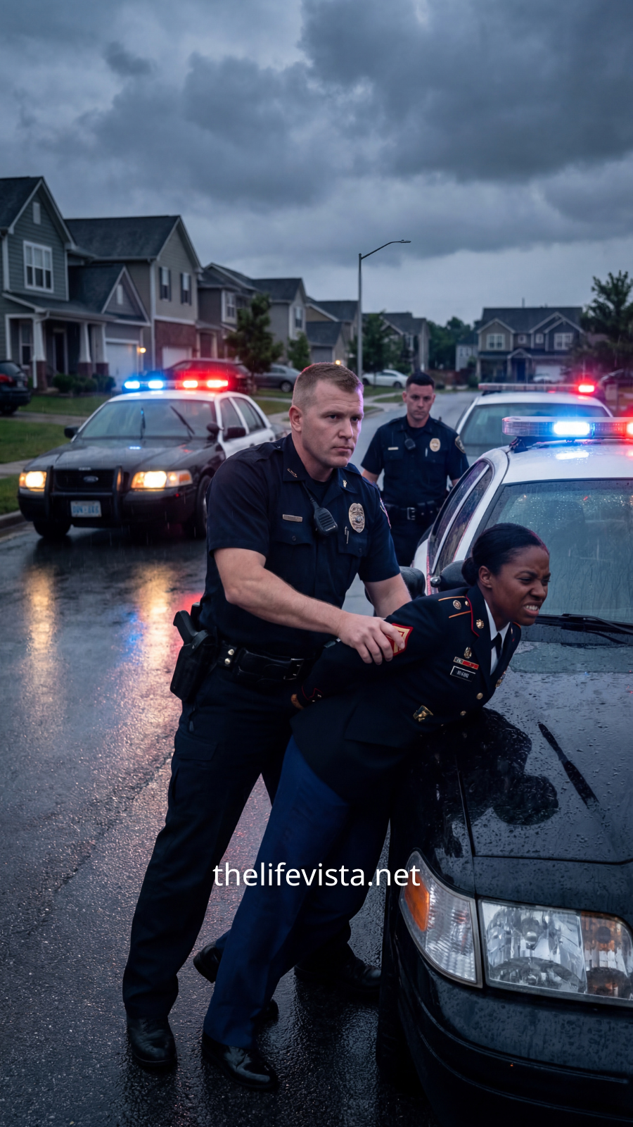 Officer Dylan Mercer approached first—white male, late thirties, one hand resting on his holster like it belonged there. Officer Evan Pike lingered a few steps back, scanning her car and the empty sidewalks. Mercer didn’t greet her. Didn’t introduce himself.