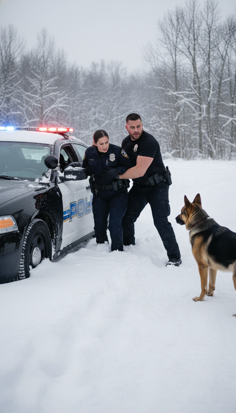 Down a shallow embankment, barely visible under drifting snow, lay an overturned police cruiser. Its lights were dead. The driver’s door was crushed inward. Snow was already piling against the windshield.
