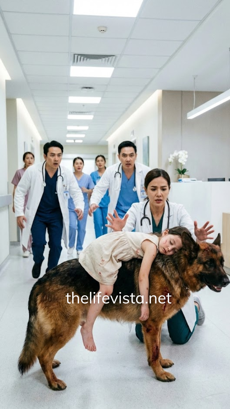 The Shepherd followed close, so close staff had to move around him, but he never snapped at anyone. He only tensed when the girl’s body flinched—growling low, almost like he could feel pain through the air and hated every second of it.