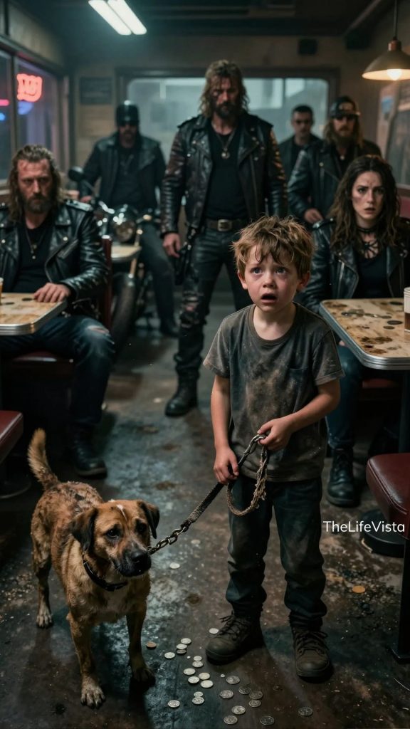 It was a child, no older than seven or eight, walking alone with a hesitant but determined step. His brown hair was unkempt, his oversized T-shirt hung loosely over his small frame, and his worn sneakers told a story of long days and little comfort. In his hand, he held a thick leather leash, and at the other end walked a large dog whose movements were careful and uneven, favoring one leg as it stayed close to the boy as though drawing strength from him. The pair moved steadily through the diner, passing tables and counter stools, drawing curious glances but no immediate interference, until they reached the booth occupied by the bikers. Without hesitation, the boy stepped forward and placed a handful of crumpled bills and scattered coins onto the table, the soft clinking sound cutting through the low hum of the room and pulling every eye toward him.