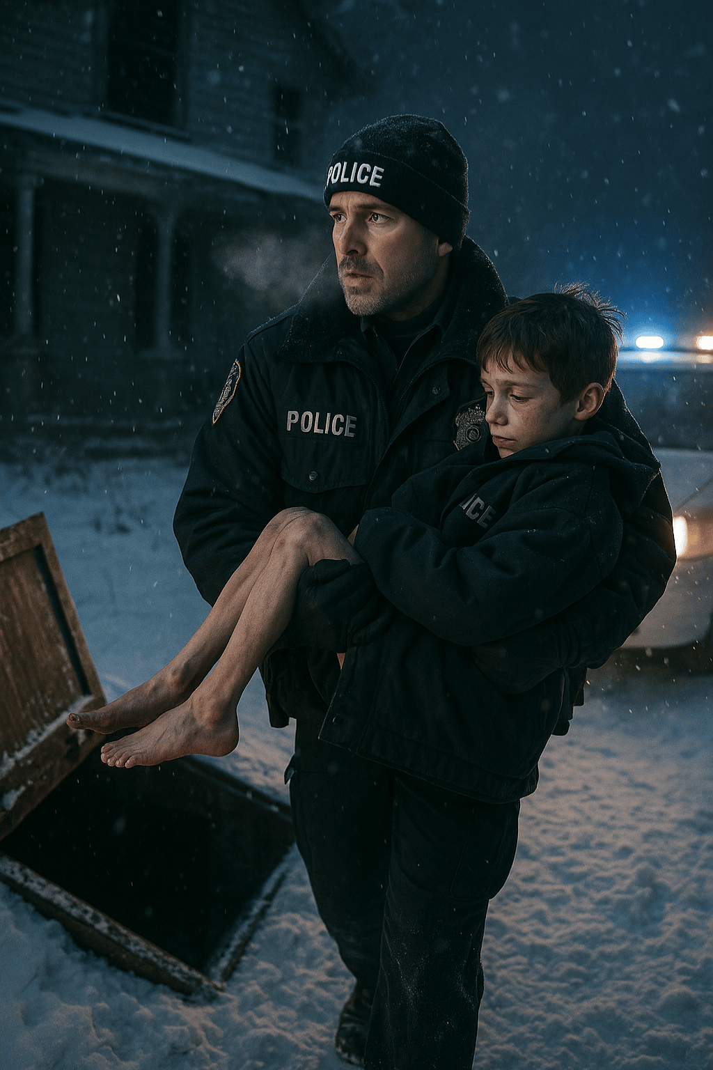 Officer Mark Bennett sat behind the wheel of his cruiser, the engine humming a low, steady rhythm against the cold. His shift had ended hours ago. He should’ve been home. He didn’t always know why he kept driving — patrolling the frozen streets long after he’d clocked out. Maybe it was the quiet. Maybe it was the ghosts.