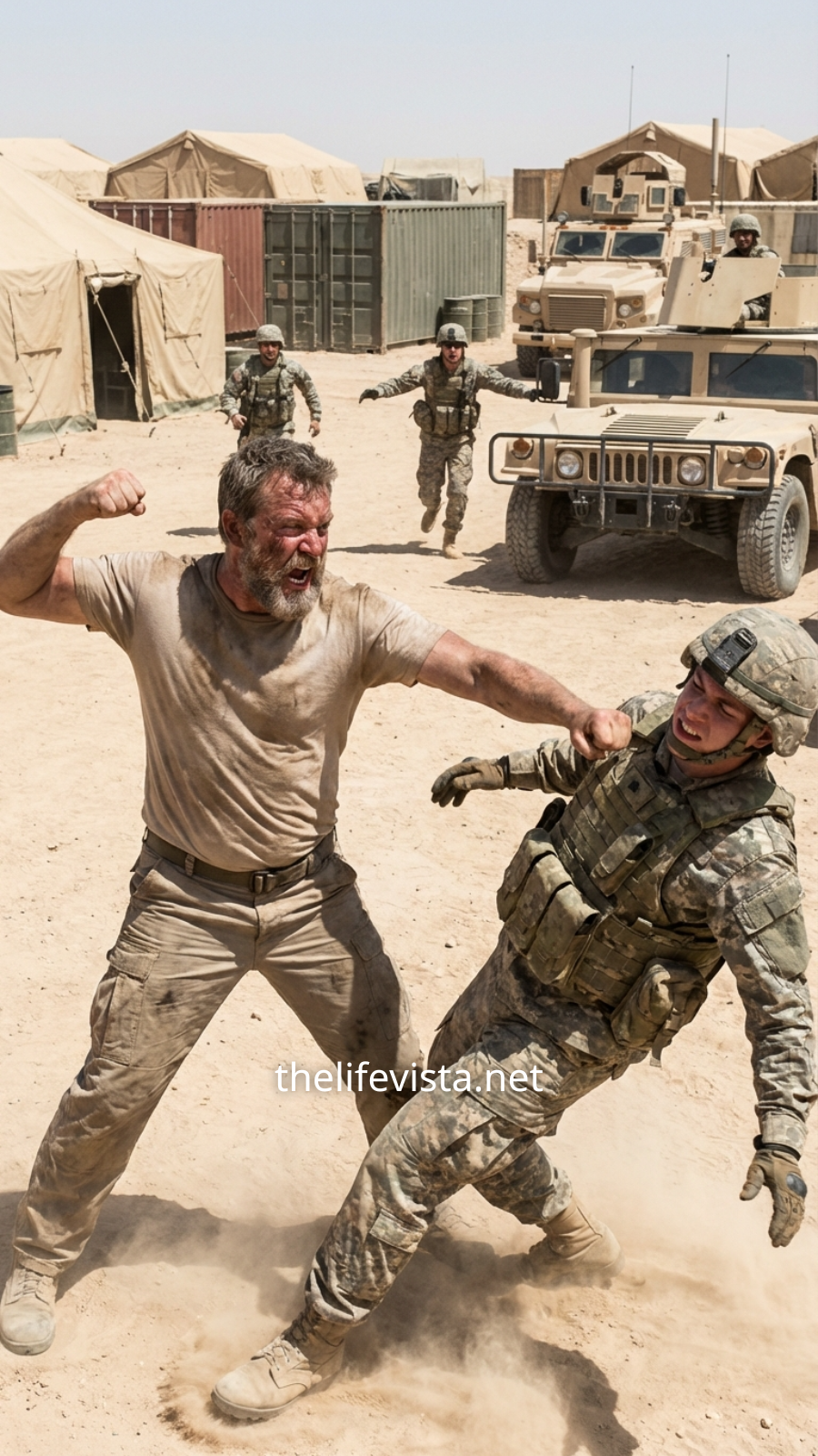 The words were not merely spoken—they were flung. They came from Staff Sergeant Brandon Kade, a man built like a concrete barricade, with a voice that sounded like gravel crushed beneath tank treads. His fist—a hard knot of bone, scar tissue, and bad temper—followed the insult, slicing through the cool air and landing with a sound both sharp and wet. It was the unmistakable sound of knuckles colliding with jawbone, and it rang out across the dusty training ground with sickening finality.