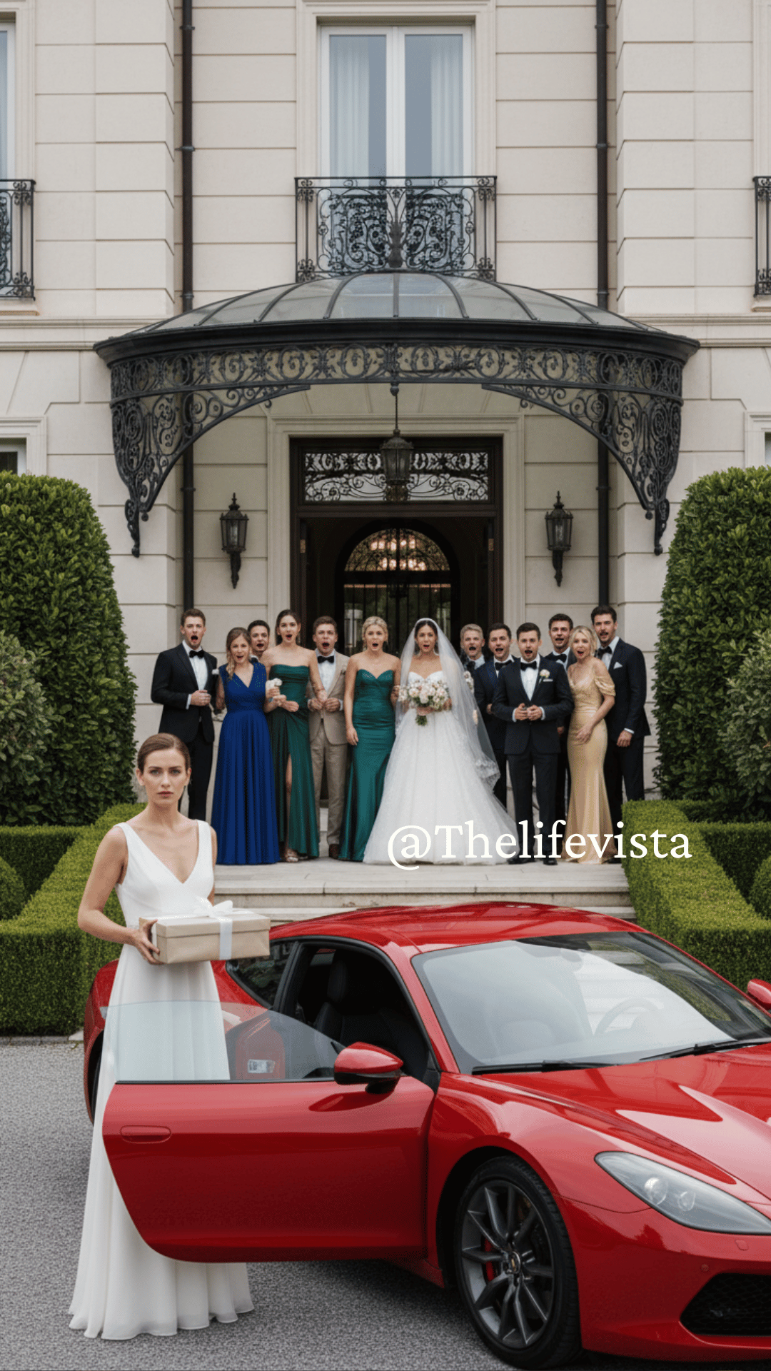 Just as the MC invited the couple to cut the cake, the roar of an engine outside drowned out the orchestra. Tires screeched. Smoke rose. A black supercar stopped sharply at the entrance, turning every head in the hall.