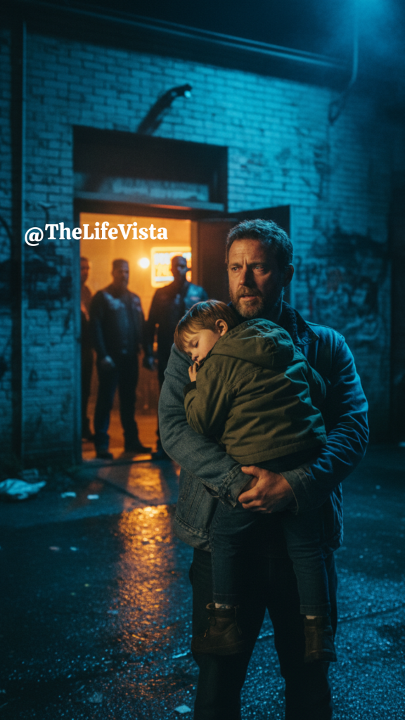 A man in his early thirties, worn down in ways sleep couldn’t fix, standing in the doorway with a small boy asleep against his chest. The child’s face was buried into a frayed denim jacket that smelled faintly of rain and exhaustion. One of the man’s hands supported the boy’s back; the other trembled—not from fear, but from hunger, fatigue, and the weight of a choice he never thought he’d have to make.
