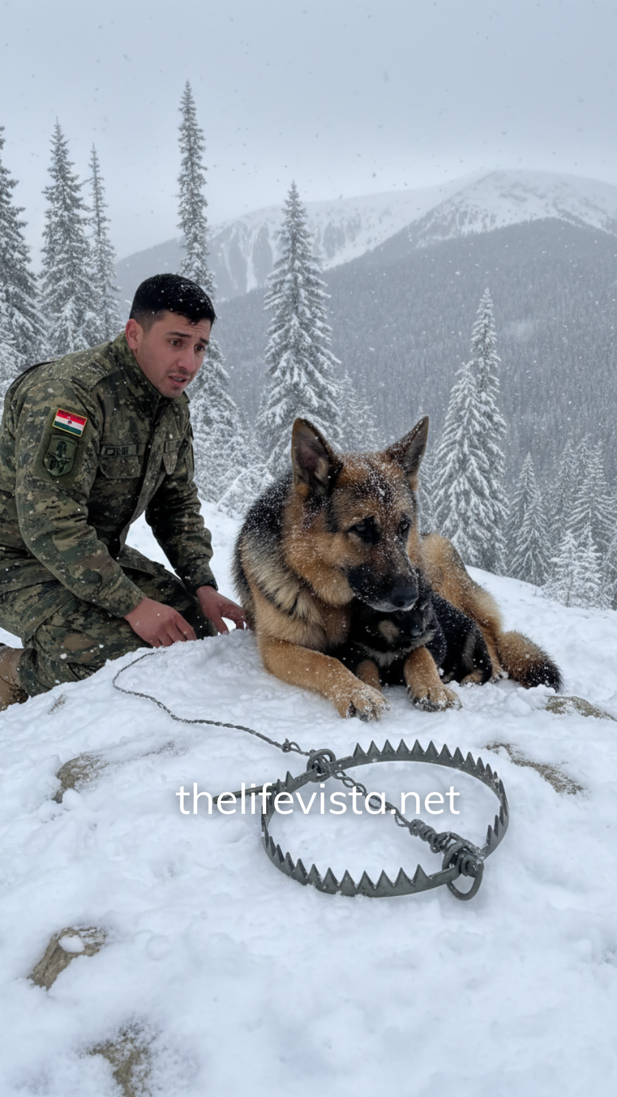 The German Shepherd lay in the drift like a soldier who refused to quit. Her fur was iced stiff, her breathing thin and ragged. A steel leg trap clamped her front limb, teeth sunk deep, blood staining the snow dark as ink.