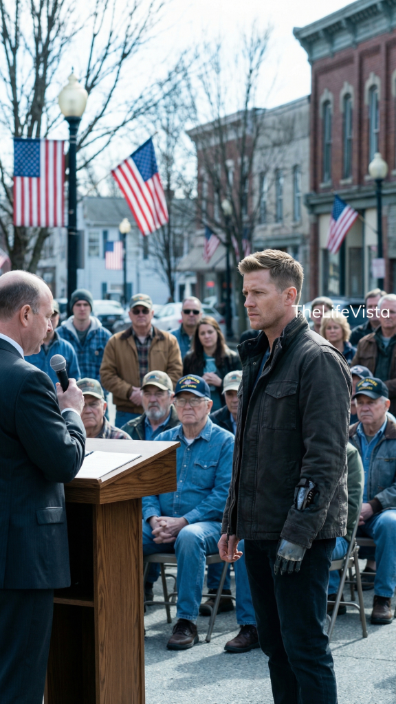 The next morning arrived bright and clear, the kind of day that seemed almost too clean for what it represented. The town square had been arranged with careful effort, rows of chairs facing a small stage dressed in red, white, and blue. Daniel stood at the edge of the crowd as the ceremony began, watching rather than participating. When the mayor stepped forward, his confidence filled the space easily, and at first, Daniel listened without reaction. The words were polished, familiar, and carefully shaped.