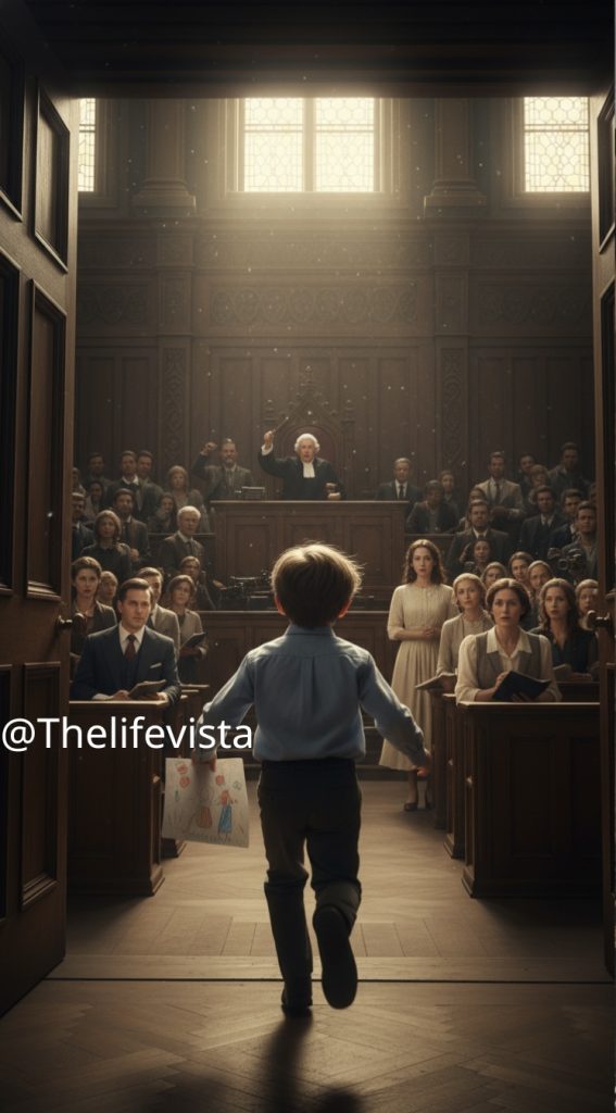 Then, the door at the back of the courtroom creaked open. A small figure ran down the aisle—Liam, clutching his drawing tightly. “Stop!” he shouted, his voice carrying over the murmurs. All eyes turned. The young boy stood before the judge, tears streaming down his face.
