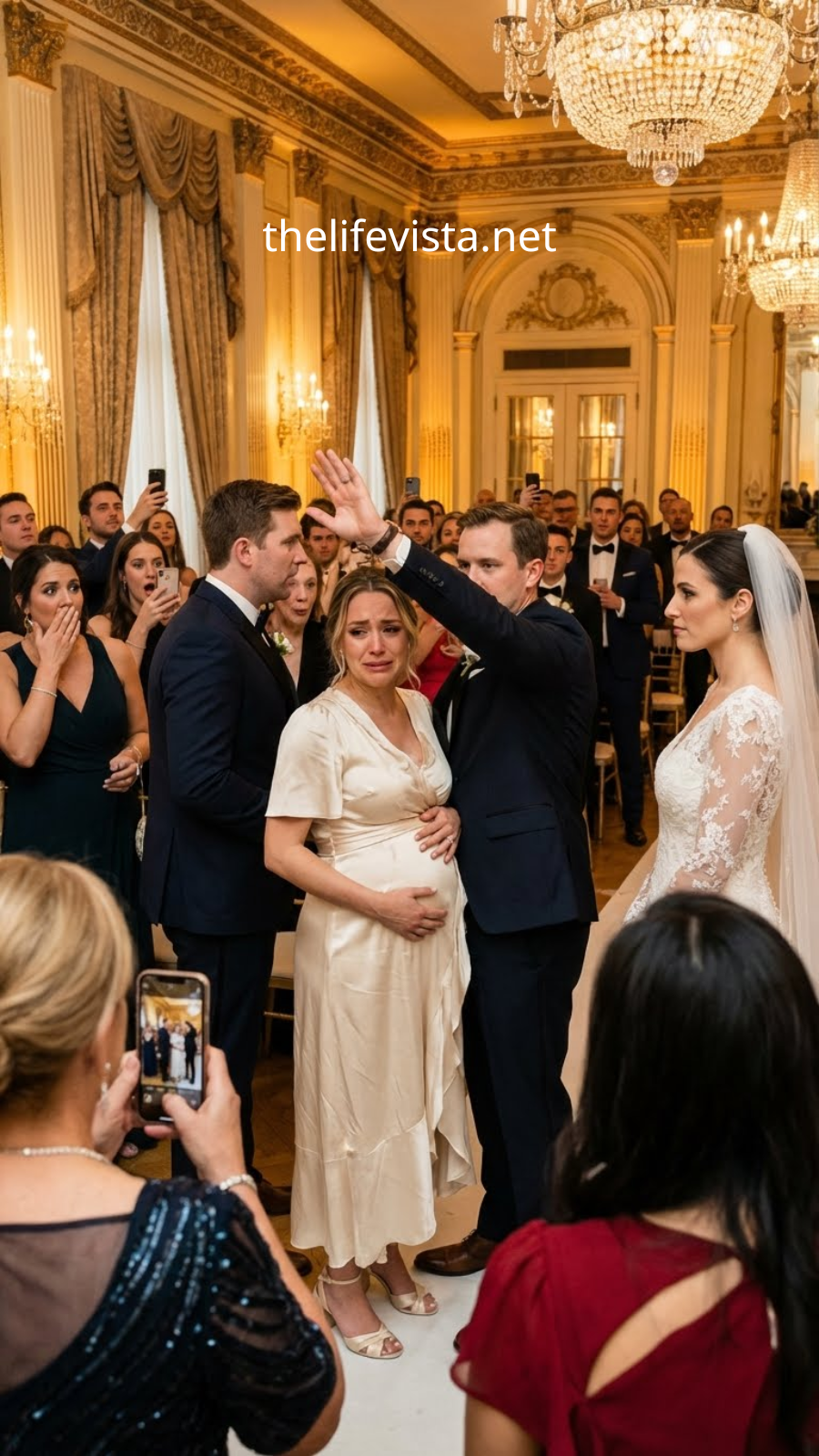 His face contorted. The “mask of the golden boy” finally slipped. In a move that happened so fast the cameras barely caught the start of it, Lucas reached out. His hand didn’t go for her face or her shoulder. He grabbed the delicate silk wrap of her dress at the hip.
