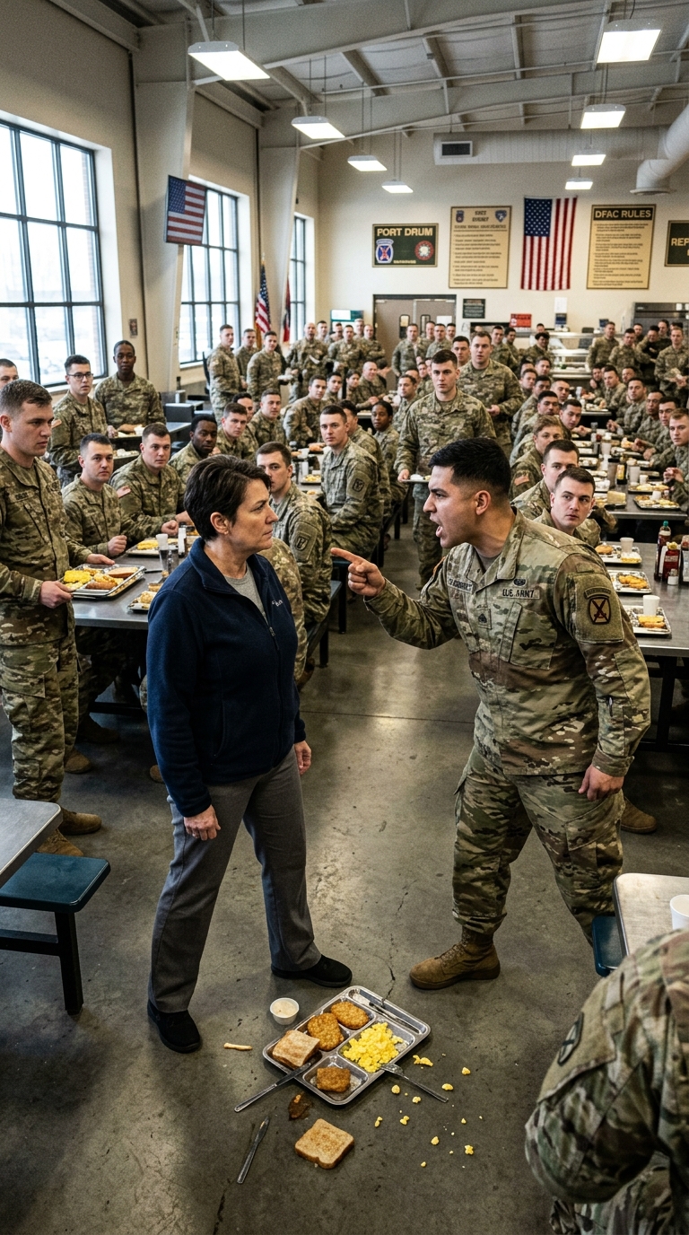 At the center of the serving line stood Sergeant First Class Derek Nolan, a man who had built his reputation on discipline—sharp, uncompromising, and, to many, unnecessarily harsh. His presence alone was enough to straighten spines and silence conversation.