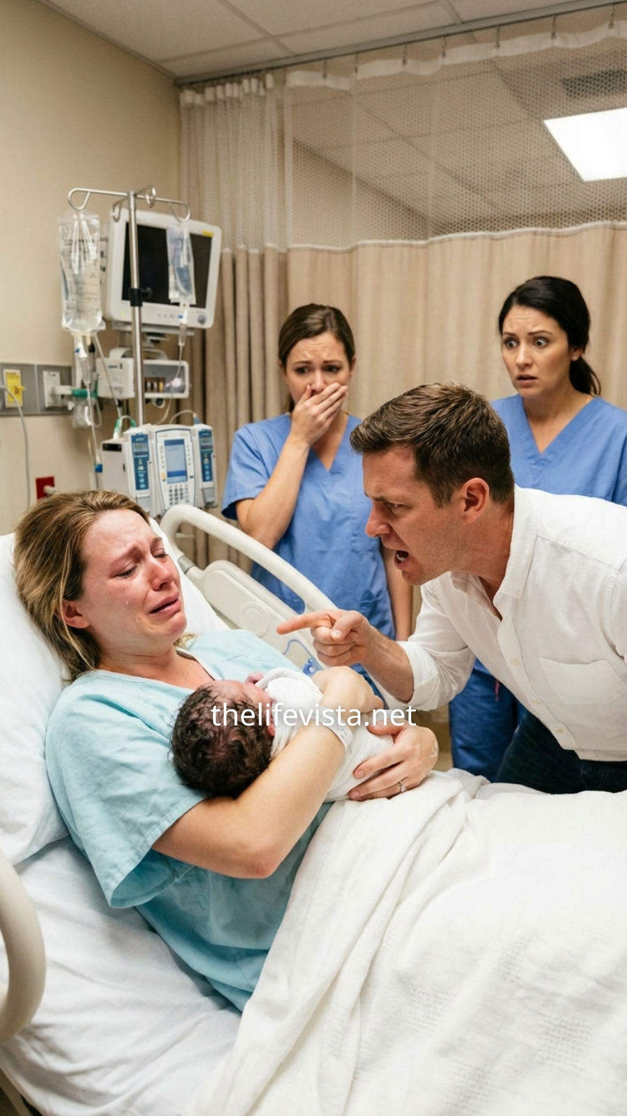 Emily, still weak from labor and struggling to understand what was happening, looked at him in shock.