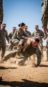 As the crowd formed a wide circle on the training ground, the skepticism was almost palpable. Soldiers whispered, some smirking at the prospect of a petite woman showing them how to fight.