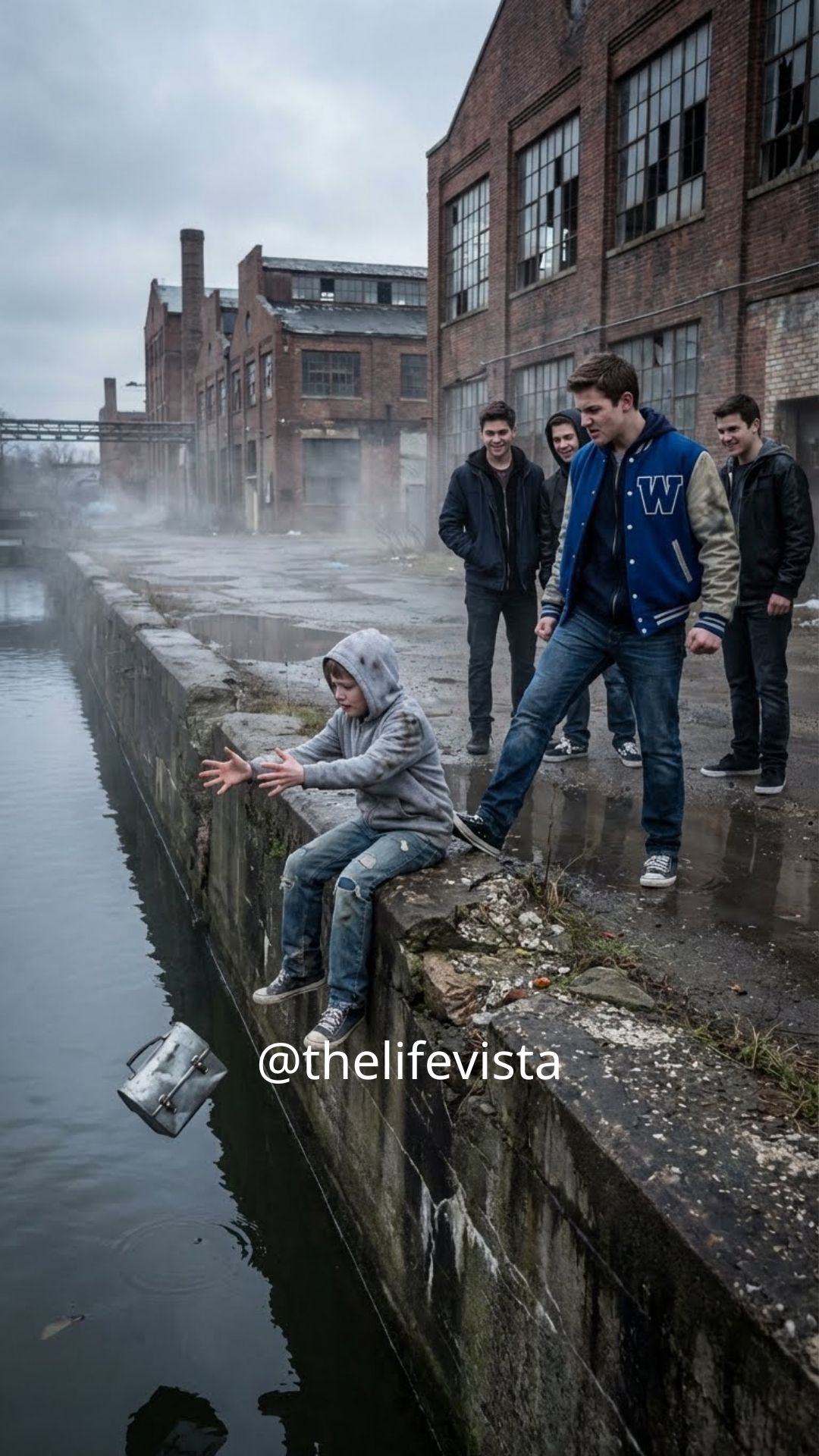 Logan froze, the laughter dying in his throat. The dock beneath him groaned, then cracked, splitting apart. Panic replaced his arrogance. His friends were already scrambling backward, nowhere near helping. Logan’s footing gave way, and the end of the dock tipped into the black creek, pulling him with it. Ethan could only watch, chest tight, as the boy who had destroyed his world dangled, clawing for something solid.