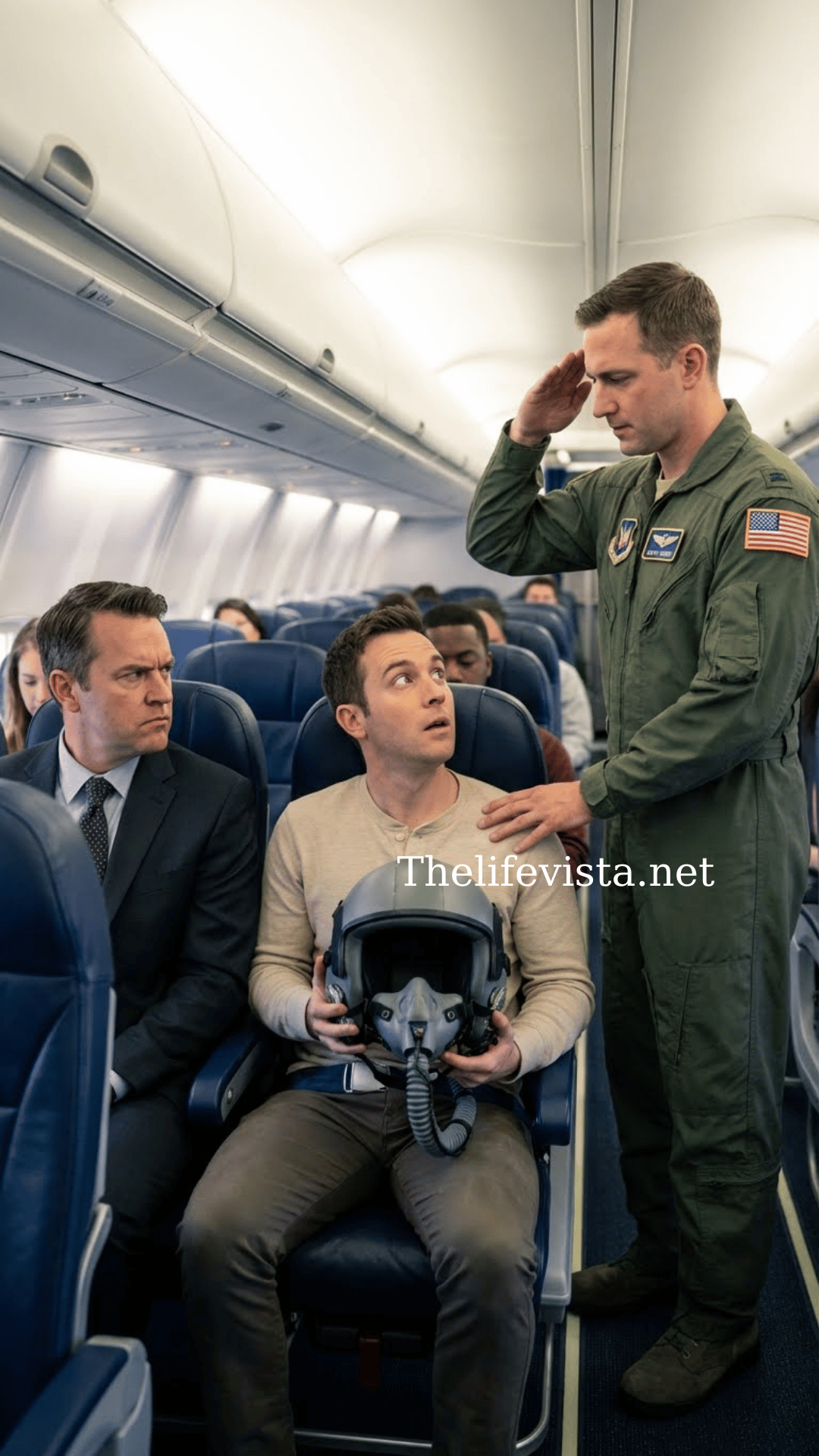 Back at the base, Lieutenant Lena Hayes stood beside a bulletin board in her unit’s break room. Pinned to the center was a newly printed photo taken from a civilian cell phone on Flight 728. It showed the moment Michael Lane stood to salute Captain Marcus Reeves.