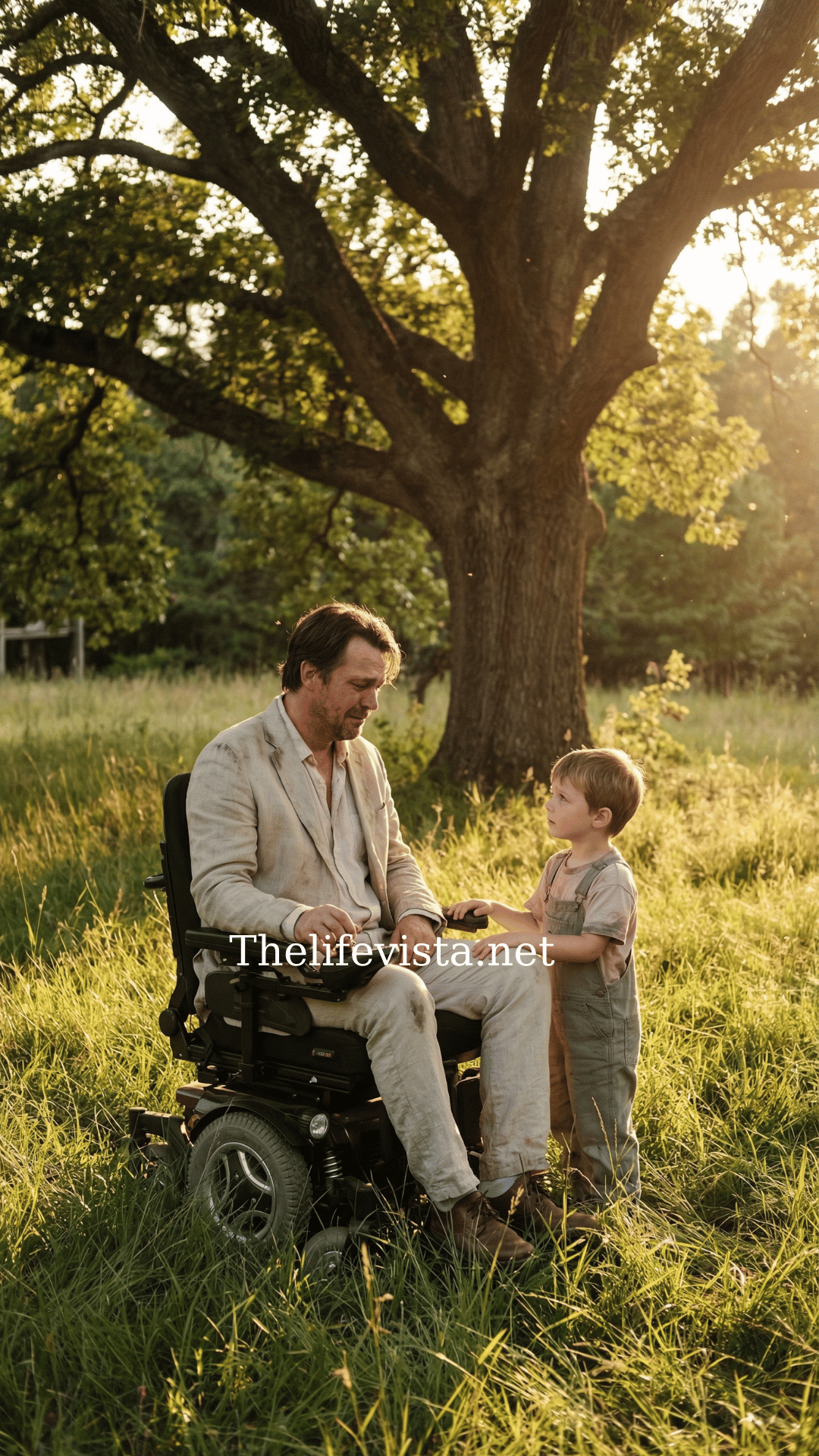 A wealthy man in his mid-30s sits in a wheelchair under an old oak tree in a large backyard at sunset. His face is tired, eyes wet with tears. A small six-year-old boy stands beside him, gentle and calm. The world feels still.