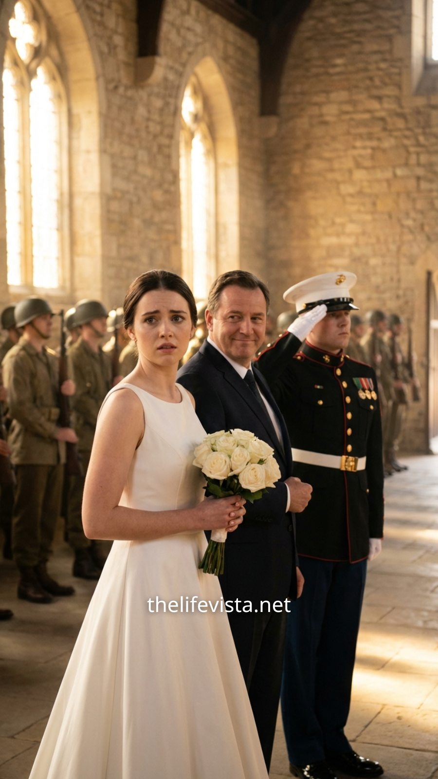 She stood there, her gown catching the light, her silence louder than the noise. Then, from one of the SUVs outside, a figure emerged. A soldier, his face hidden by a mask, stepped into the church.
