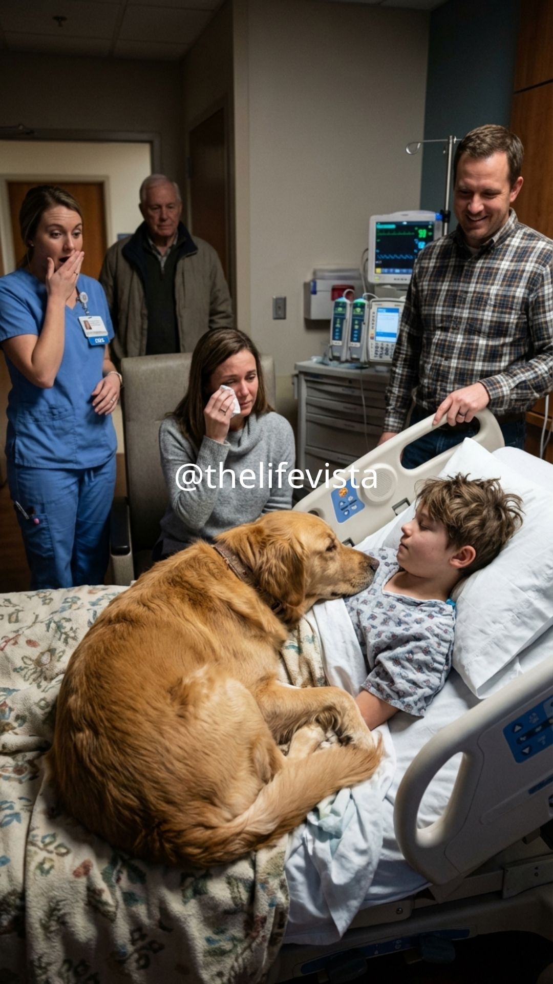 Everyone in the room watched in stunned silence as the boy’s body gradually relaxed beneath the warm, steady weight of the enormous dog, and in that moment it felt as though something invisible had shifted, something that medicine alone had not been able to reach.