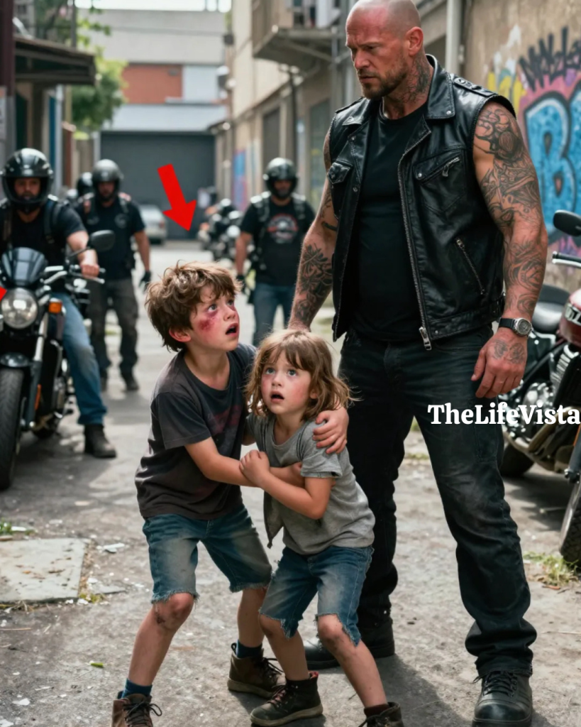 The man stepped forward with a calm that felt more dangerous than anger, and Jordan understood without anyone saying it that this had to be the father Ella had mentioned, the man the bullies had tried to use like a ghost story. His road name was Grim, and he didn’t need to raise his voice to make the alley feel smaller. He looked down at Jordan’s split lip and swelling jaw and the way Jordan’s arms curled instinctively toward his ribs, then he looked at the scattered crayons and the torn backpack, and his jaw tightened by a fraction. He asked if Jordan was the kid, and Jordan blinked through the haze and managed to ask what kid, because his brain was still trying to catch up with the new reality.