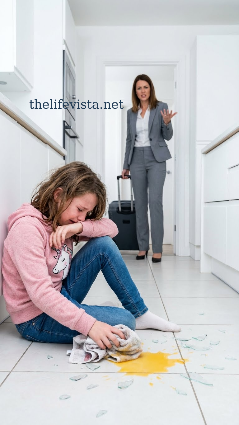 A small figure appeared at the kitchen doorway. My daughter, barefoot, rag in hand, knees bent over the floor, scrubbing. Her cheeks were flushed, her shoulders trembling. The smell of bleach stung my nose.