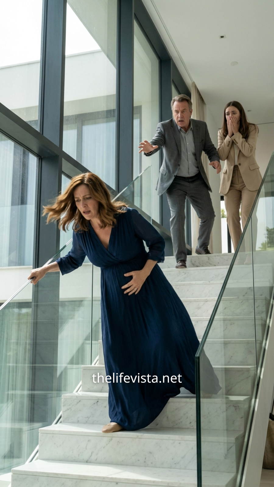 She never finished the sentence. Nathan moved quickly, crossing the room before she could step back. His fingers clamped onto her shoulders hard enough to send a sharp bolt of pain through her arms. She gasped and tried to twist away, but her heel slipped against the polished floor. The room lurched violently. Shelves blurred in her vision. Her body tipped backward into empty air. She heard her own scream before the brutal impact as her side and head slammed against the edge of a low table before she crashed to the floor.