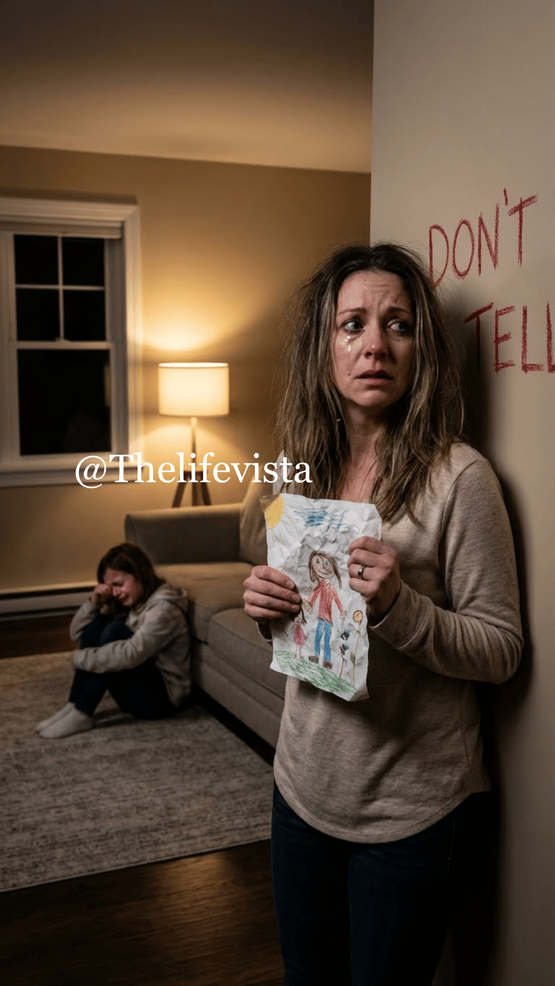 The drawing was crude but clear. A small girl in the corner of a room. Two tall figures standing over her. One holding a belt. The other pointing at a door. The girl’s mouth was crossed out with thick black lines. On the wall, written in uneven letters, was a sentence Olivia could barely spell.