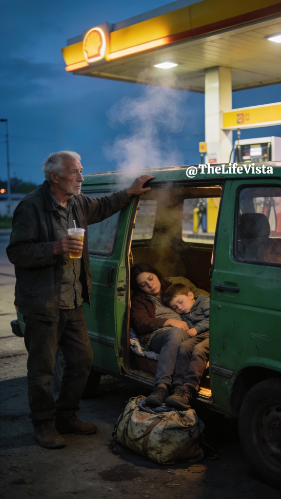 That night at the gas station, the lot was nearly empty. A few vehicles were parked haphazardly near the pumps. As I rested, my eyes drifted toward a dark blue transit van sitting far from the lights. Something about it felt wrong. The interior light was on, dim but visible, and through the window I saw the silhouette of a woman slumped forward, asleep while sitting upright. In the back seat, a small child was curled into himself, knees tight against his chest.
