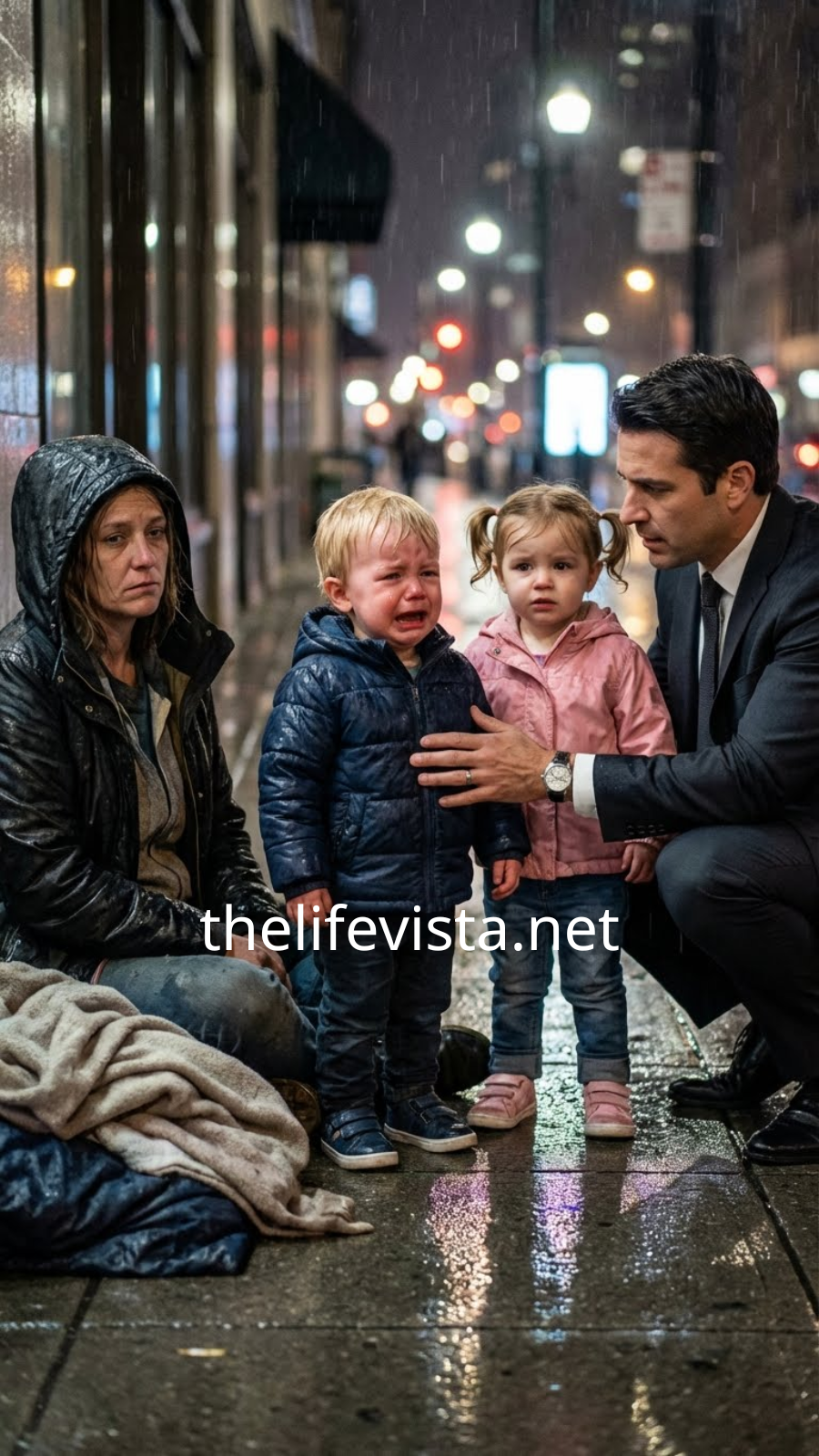 Clinging to her were two toddlers—a boy and a girl, no more than two years old. They cried in thin, frantic voices, their small hands gripping her coat as traffic thundered past, indifferent and merciless.