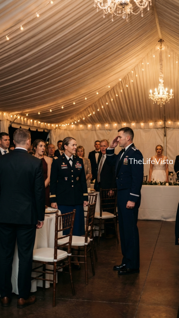Every movement was precise. He crossed the dance floor and stopped where everyone in the tent could see him. There, in front of three hundred guests, he came to full attention. His heels struck together with a sharp crack that silenced the room more completely than anger could have. Then his hand came up in a salute so crisp it changed the air.