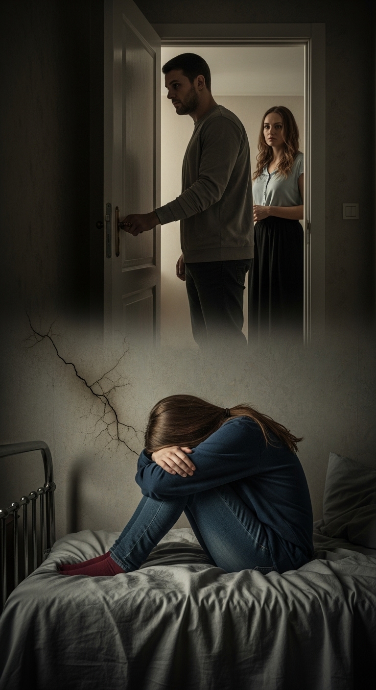 “Dad was with Aunt Jenna… in your bed. When they saw me, he threw me down the stairs. They’re still there… drinking whiskey…”