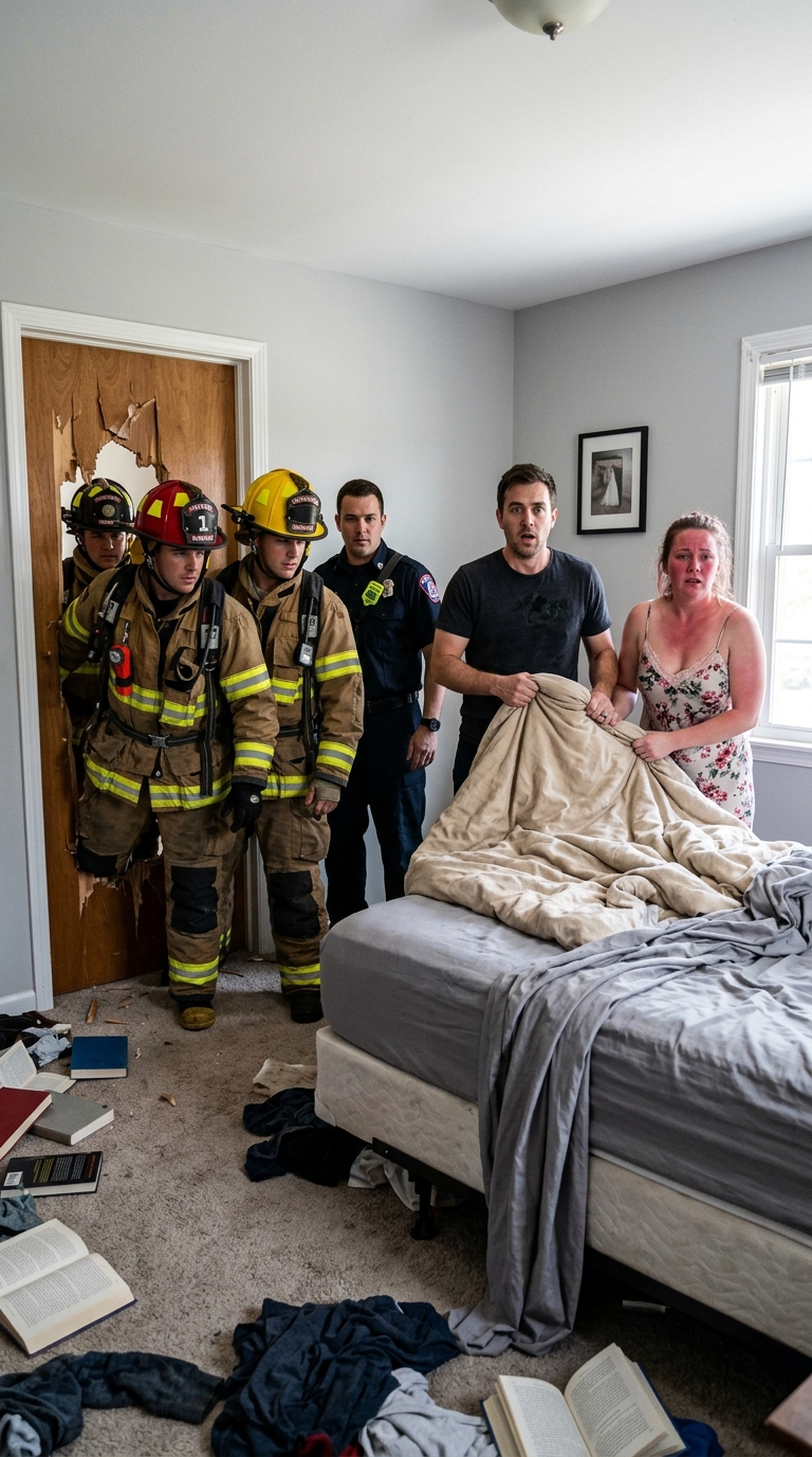 Within minutes, sirens echoed outside the building, drawing neighbors into the hallway as firefighters rushed upstairs with equipment. The bedroom door had to be forced open, and the silence that followed lasted only seconds before shocked murmurs filled the apartment. My husband and my daughter-in-law were carried out under a blanket, tangled together in humiliation as whispers spread through the crowd faster than the firefighters could control.