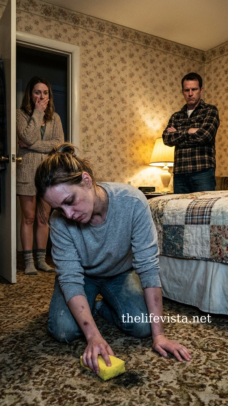 Lily—my twin, my other half—was on her knees, scrubbing the floor with trembling hands. Dark bruises covered her arms. Her cheekbone was swollen. She wore old, torn clothes soaked with cleaning chemicals. Her hair was tied back harshly, almost painfully.