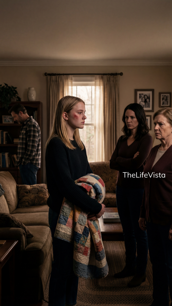 I remember looking toward the living room then and seeing my father sitting there. He had heard every word. I knew it by the way he held himself, too still, too careful, like a man hiding from his own reflection. He did not say anything. I did not stay long enough to discover whether his silence was cowardice, confusion, or exhaustion. I grabbed the dirty blanket, left the house, and called my grandmother from the sidewalk with tears freezing against my face.