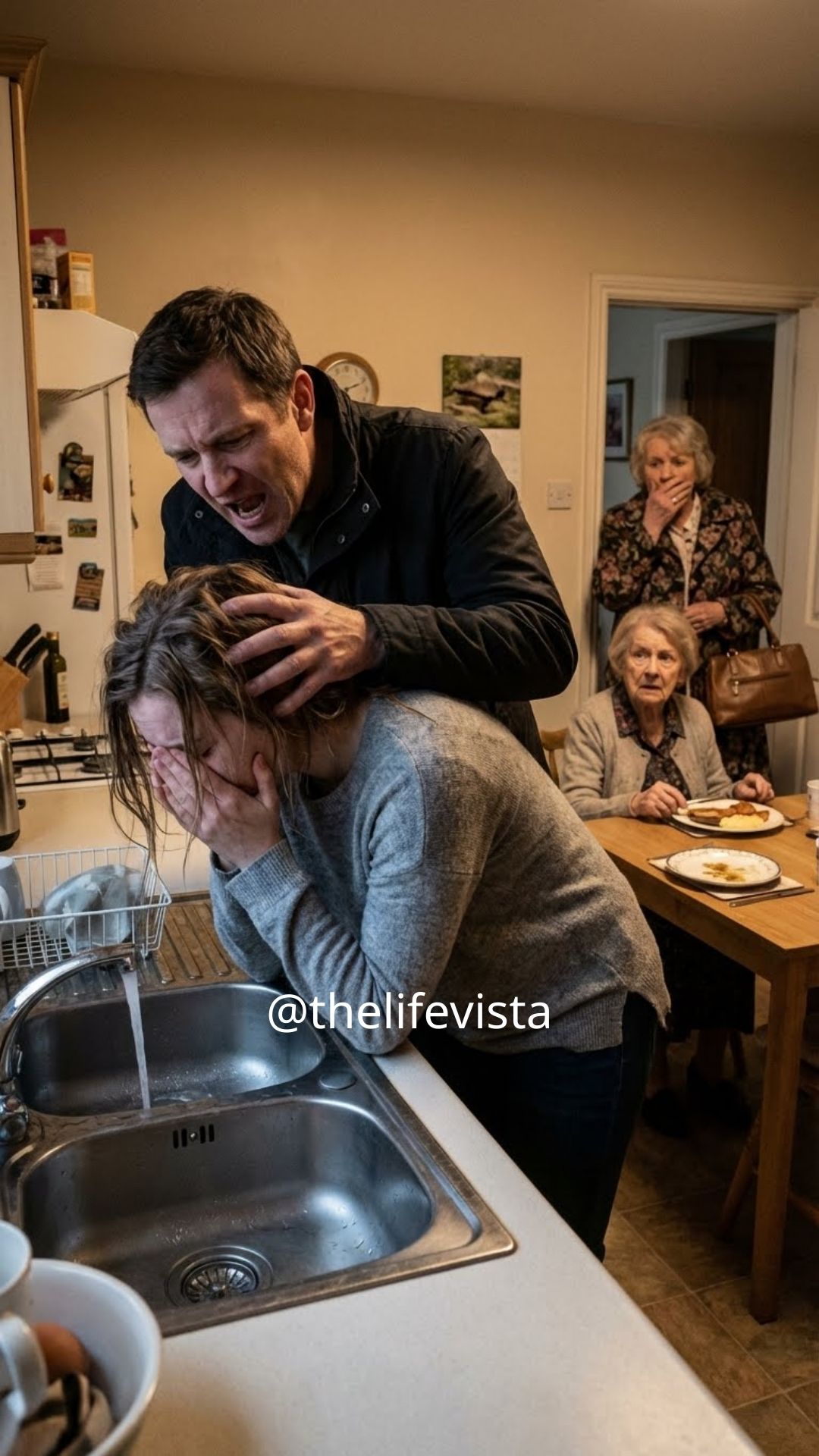 The heater was barely working. The living room windows were sealed with old tape, and the air smelled of cold grease. At the small dining table sat Emma’s husband, Jason, and his mother, Carol. They were eating hot food, steam rising from their plates, coats still on their chairs. Emma stood at the sink with her sleeves rolled up, hands deep in soapy water. Her shoulders trembled slightly as she scrubbed, her hair pulled back hastily, her face pale.