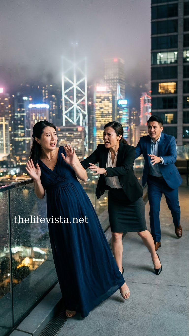 In one terrifying motion, she dragged me toward the low stone railing at the edge of the terrace. For a split second, I saw the city below—traffic, headlights, people laughing on the street.