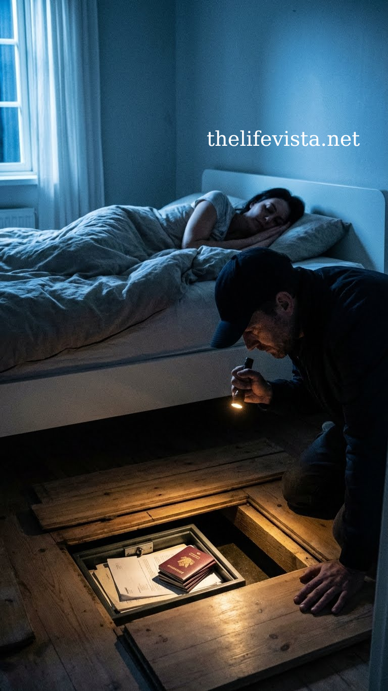 Lying there with my breathing carefully controlled, I watched through barely cracked eyelids as Lucas lifted a metal box from the space beneath the floorboards. He opened it, revealing stacks of documents, photographs, and what looked suspiciously like passports—multiple passports, all with his face.