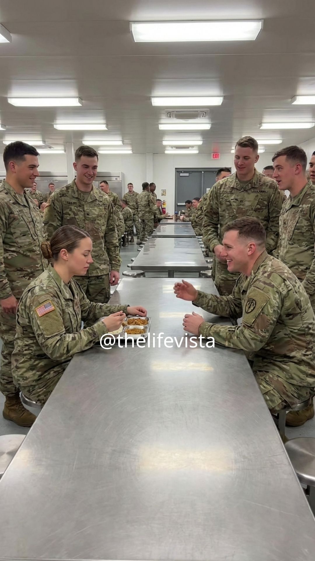 The lunch rush at Fort Ridgeway carried a rhythm so steady that even the newest arrivals learned to move within it without thinking, because trays scraped along metal rails in a measured cadence while boots dragged thin layers of dust across the polished floor and conversations folded into one another in low, hurried voices that never quite finished before the next obligation pulled them away. The smell of institutional food — overcooked rice, reheated gravy, and coffee that had been sitting too long — hung heavy in the air, mixing with the faint scent of sweat, boot polish, and the dry desert wind that always found its way inside the large hall, creating an atmosphere that felt both predictable and subtly tense.