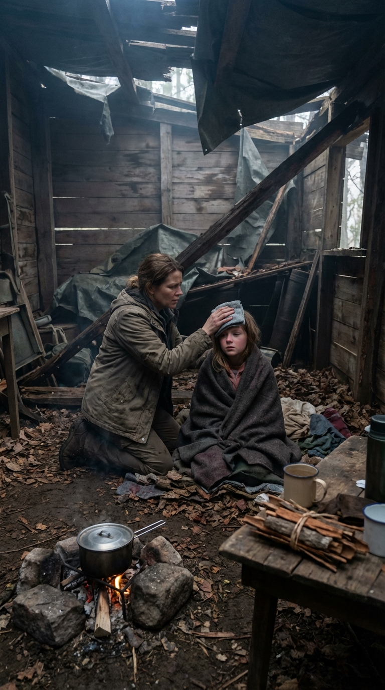 On day five, we found a shack—a run-down, half-collapsed ranger station. But it had a roof, and inside, a rusted can held salt. Actual salt. That night, Nola started shivering. Her forehead was burning. “Mom, I’m so cold,” she whispered. I didn’t sleep. I laid wet cloths on her brow and brewed a makeshift tea from white willow bark, praying I wouldn’t accidentally poison her.