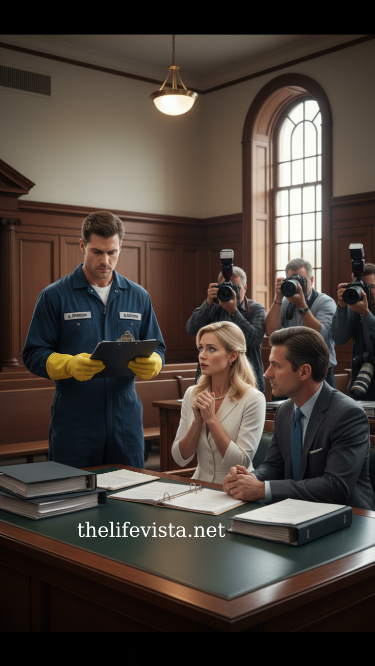 The mop slipped slightly in Logan Mitchell’s hand, the damp strands dripping onto the polished courtroom floor as 300 pairs of eyes drifted from the bench to him. For fifteen years he had mopped this room in silence. Fifteen years he had been invisible.