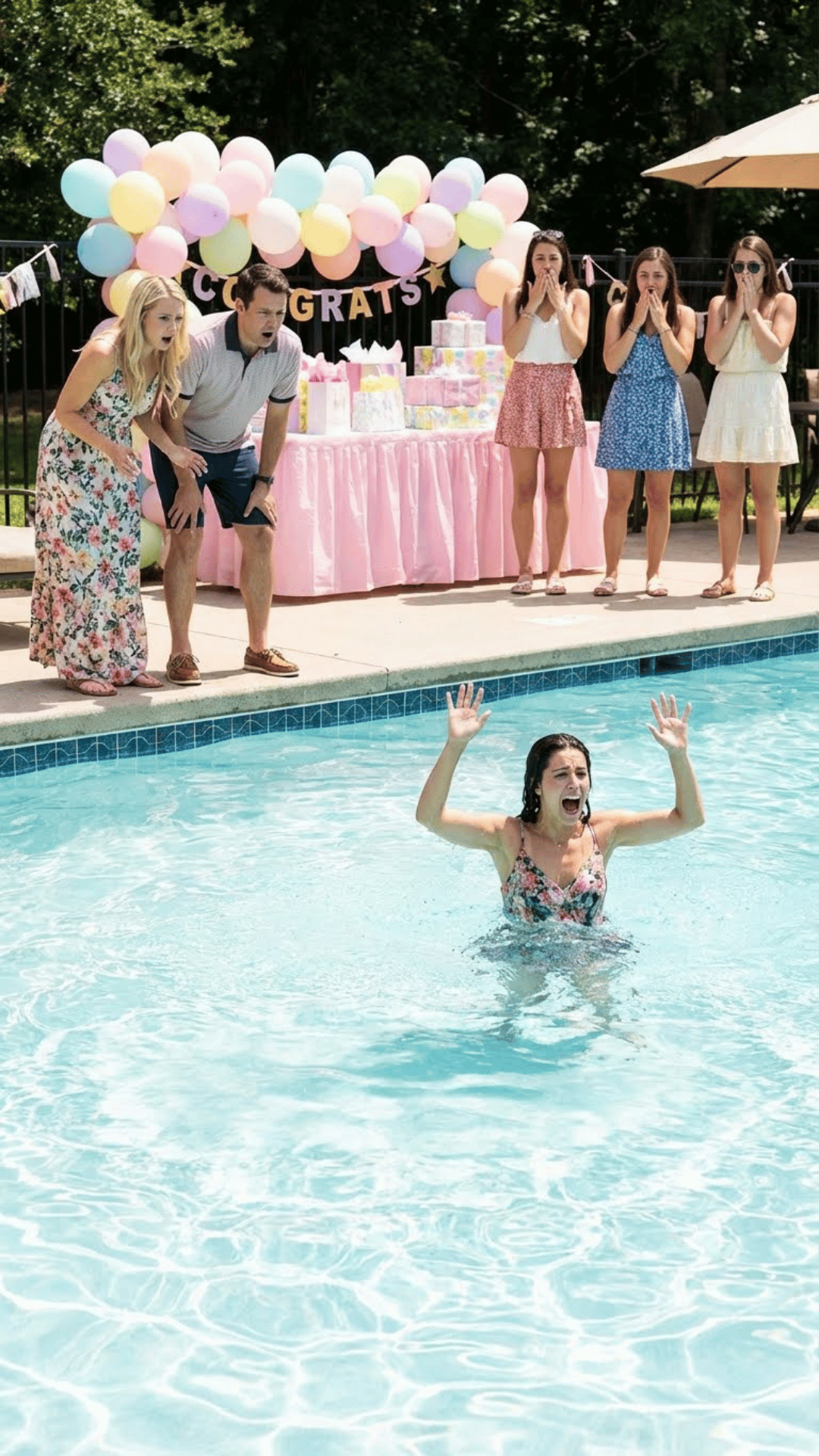 I felt my stomach lurch as I fell backward into the pool—cold water swallowing my body in an instant. Gasps erupted around me, but no one moved. Through the blur of chlorine and panic, faces hovered over the surface…just watching. Even Daniel. Even Linda.