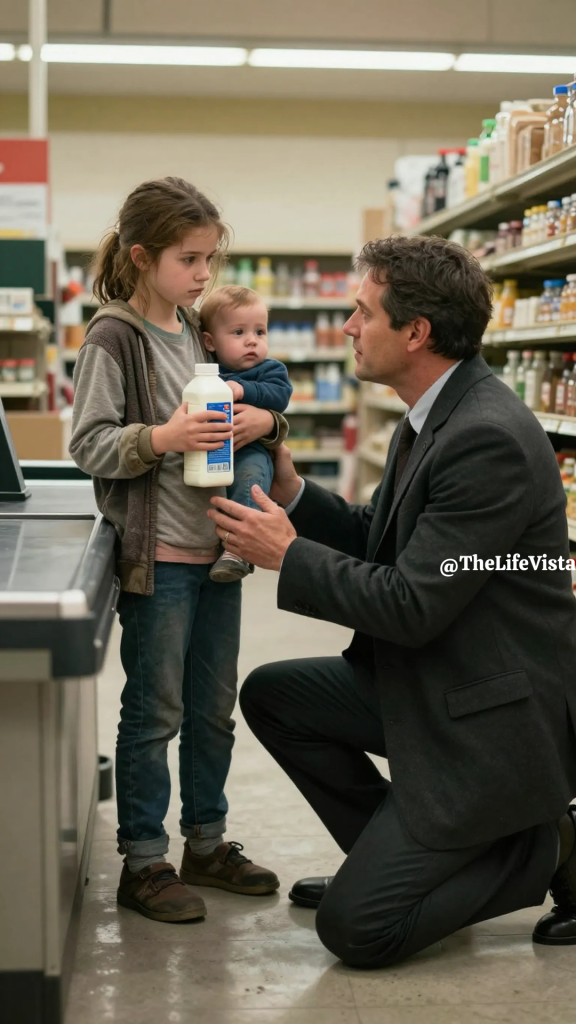 At the center of that strained stillness stood a nine-year-old girl named Tessa Rowan. She held her baby brother against her chest with one arm, supporting him with the practiced care of someone far too young to have learned that kind of steadiness. In her other hand she gripped a carton of milk so firmly that her knuckles had gone pale. The carton was not large, and yet the way she held it made it look like the most valuable thing in the building. Her brother gave a faint, tired whimper against her shoulder, and Tessa swallowed hard before lifting her chin with a courage that did not belong on a child’s face.