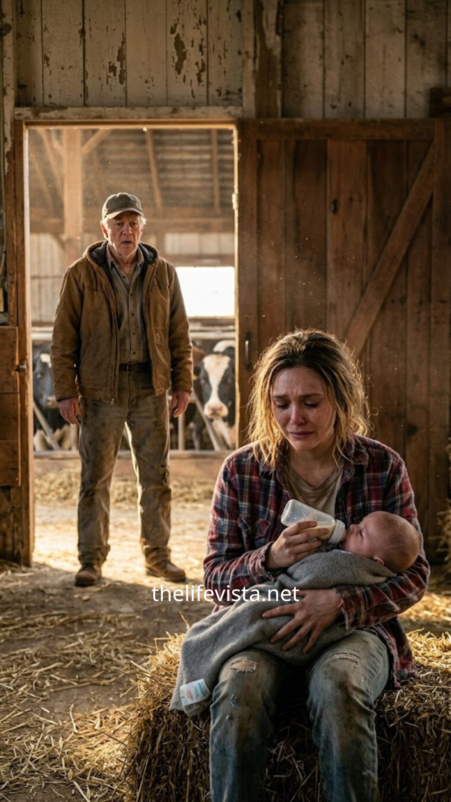 The girl lowered her gaze, pulling the baby closer as if shielding him from more than just the rain. “I can’t talk about that,” she said quietly. “I’ll work for it. I can clean, sweep, collect eggs… I don’t want to beg.” Her voice didn’t tremble with pride, but with fear, the kind that comes from knowing that being turned away isn’t just rejection, it’s consequence.