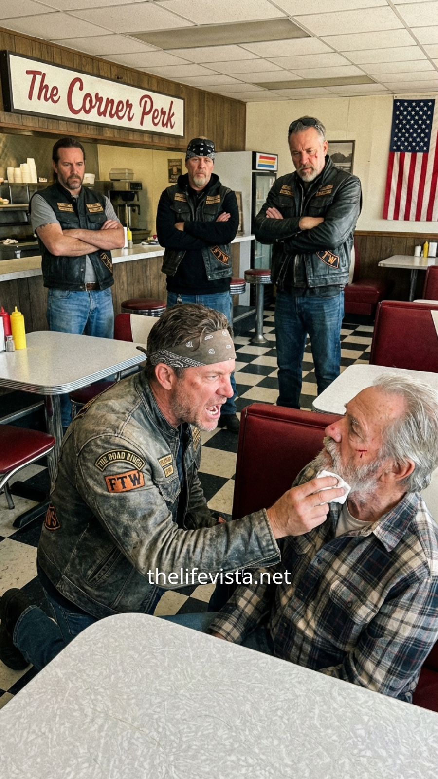 Caleb leaned back in the booth, watching his father with new eyes. He saw not just his dad, not just an old man, but a titan who carried an unshakable truth within him. The bikers quietly dispersed, taking over the surrounding booths, their presence no longer menacing but protective, like a circle of silent guardians.