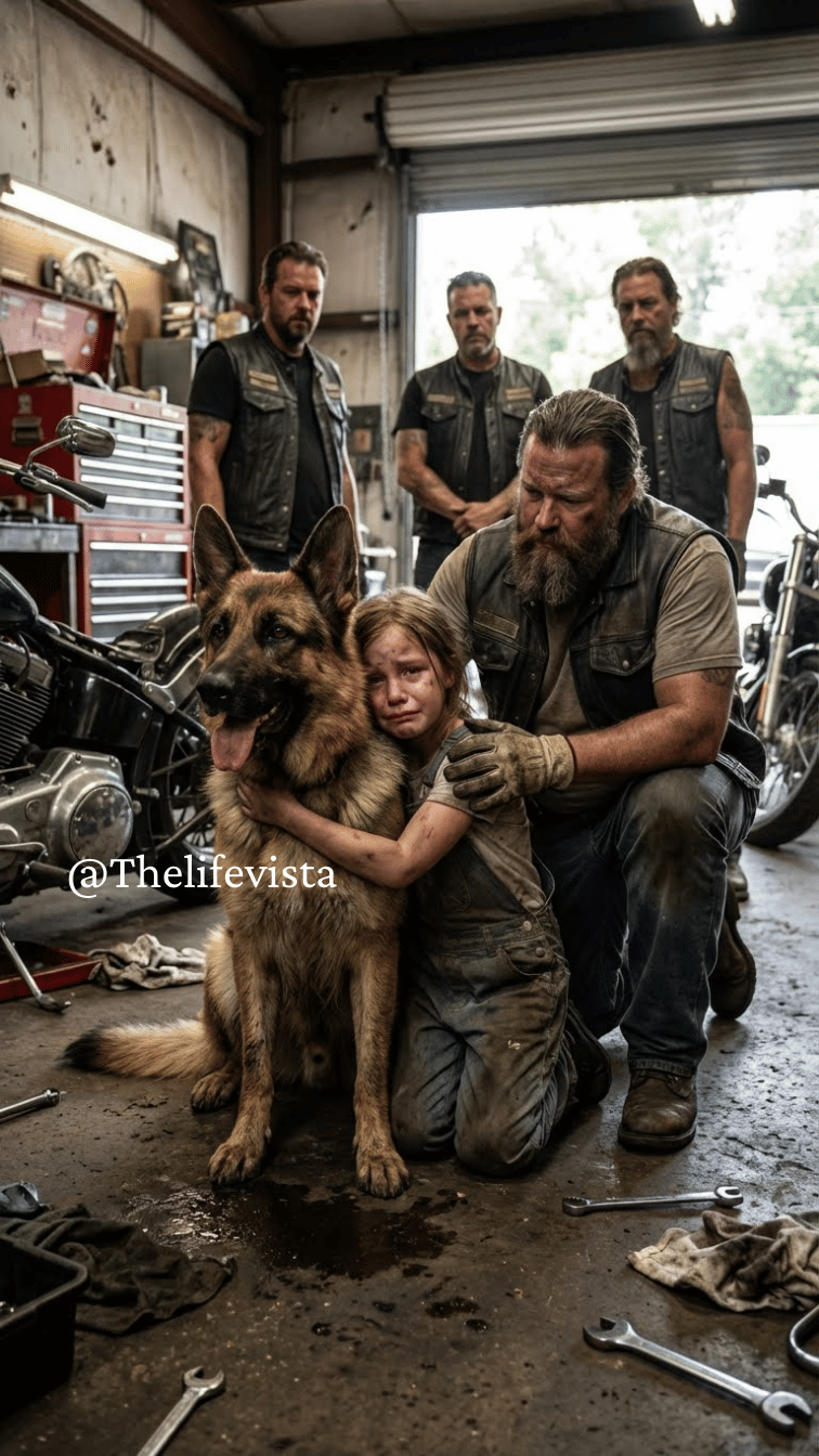 The garage erupted. Engines roared to life, shaking the very foundation of the building. I scooped Emma off the dog’s back—she was light as a feather—and settled her onto the seat of my bike, wrapping one arm securely around her.