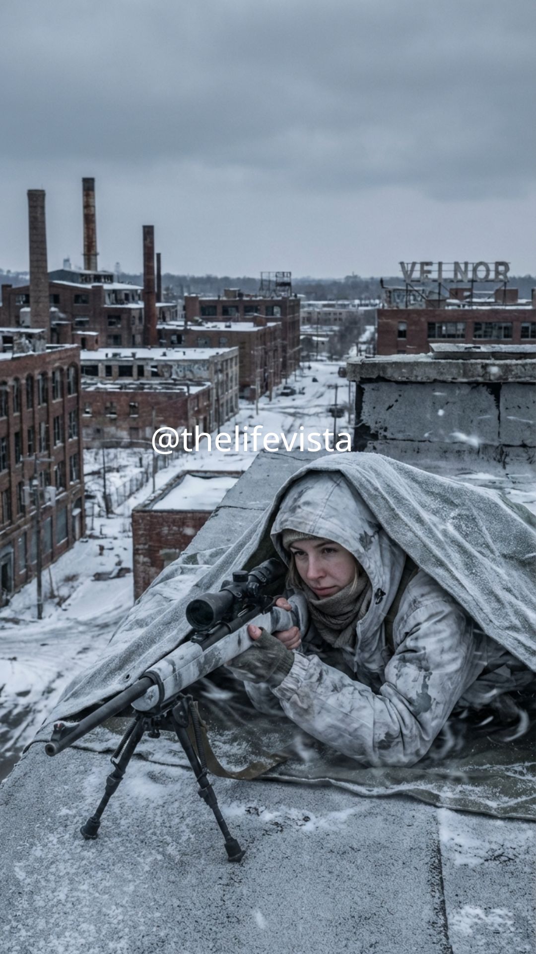 And beyond the harbor, at the far eastern extent of Velnor, a structure he hadn’t seen clearly on the maps, a water purification building, tall square, built on the shoreline. Its roof was intact. He raised his binoculars and looked at it. There was a shape on that roof. Low, still, he adjusted the focus one increment, and the shape resolved not into a clear figure, not at this distance in this flat gray light, but into something that was definitively not debris, definitively not a structural feature. The specific horizontal geometry of a human body in a prone shooting position, the slight elevation at the head, and that might have been a scope. She was watching him watch her. He held the binocular steady and breathed slowly and thought about what this moment meant. She had a rifle. She was in a stable firing position. The distance between them was roughly 1200 m long, but not impossible. Not for